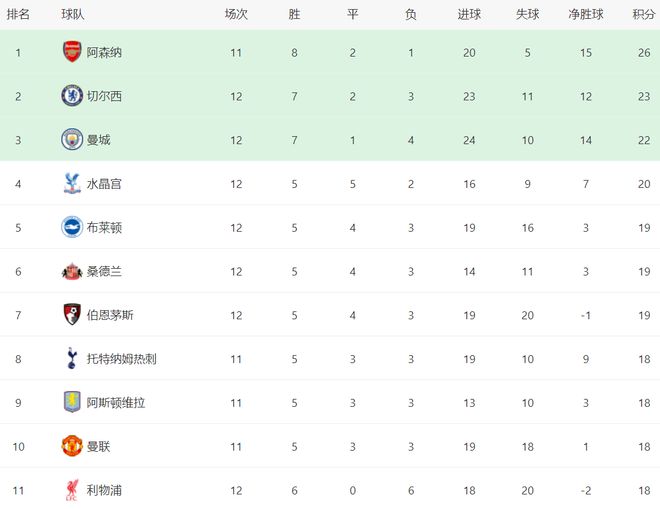 在积分榜上,阿森纳依然排名榜首,8胜2平1负,拿到26分。切尔西赢球后,总积分达到23分,排名升到第2。输球的曼城依然是22分,排名第3。第4的是水晶宫,拿到20分。布莱顿、桑德兰和伯恩茅斯都是19分。热刺、曼联和利物浦都只拿到18分。不过,热刺和曼联比利物浦少踢1场。没想到总身价高达11.5亿欧元的利物浦掉到了积分榜下半区,太奇葩了。